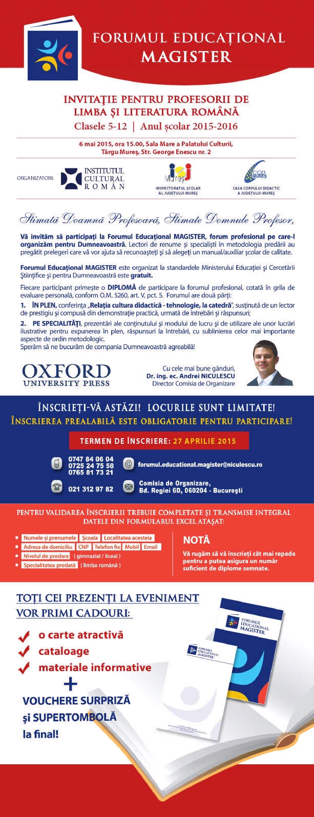 | | În atenția directorilor unităților de învățământ și a profesorilor de limba română - Salonul de Carte Bookfest Târgu Mureș